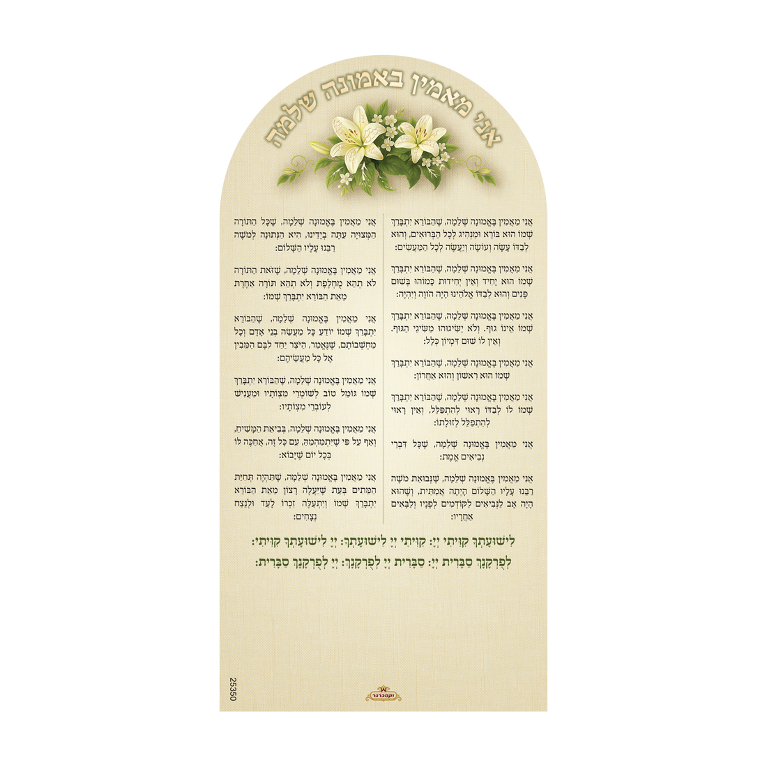 מגנט מעוצב עם נוסח י״ג עיקרי האמונה – אני מאמין, בשילוב עיטור פרחים קלאסי ועדין.מתאים...