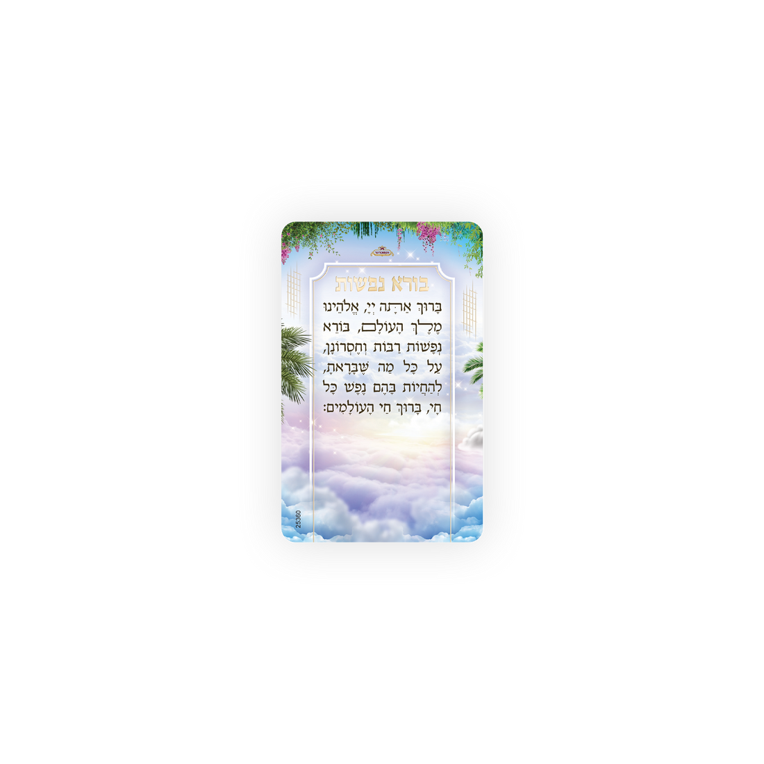 מגנט מעוצב עם נוסח ברכת בורא נפשות, בעיצוב מצויר עדין ומרשים.מתאים להצבה על מקרר, דלת...