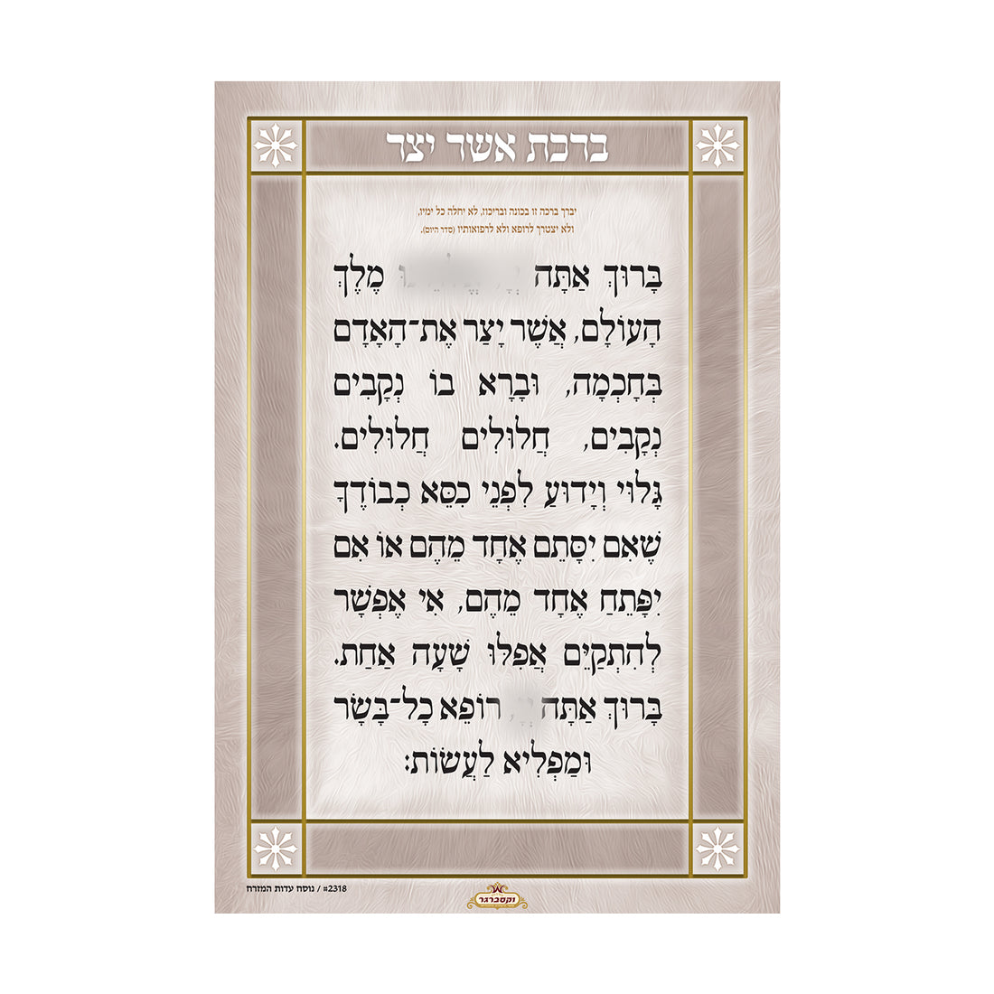 ברכת "אשר יצר" מעוצבת על גבי לוח זכוכית מרהיב, עם כיתוב ברור ומסגרת דקורטיבית, המעניקה...