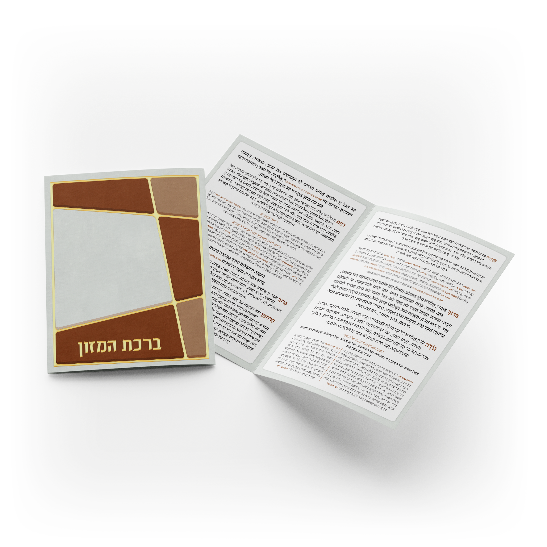 חוברת ברכת המזון יוקרתית ומעוצבת בסגנון מודרני, מודפסת על נייר כרומו עבה ואיכותי, בגודל קומפקטי של 11×16 ס״מ, ומתקפלת לשניים לנוחות מרבית.