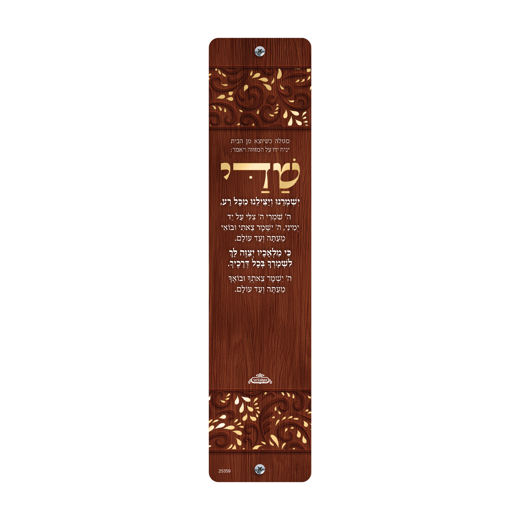 מגנט מעוצב בצורת מזוזה עם הכיתוב שדי – ישמרנו, בעיצוב קלאסי עשיר בסגנון עץ ועיטורים.