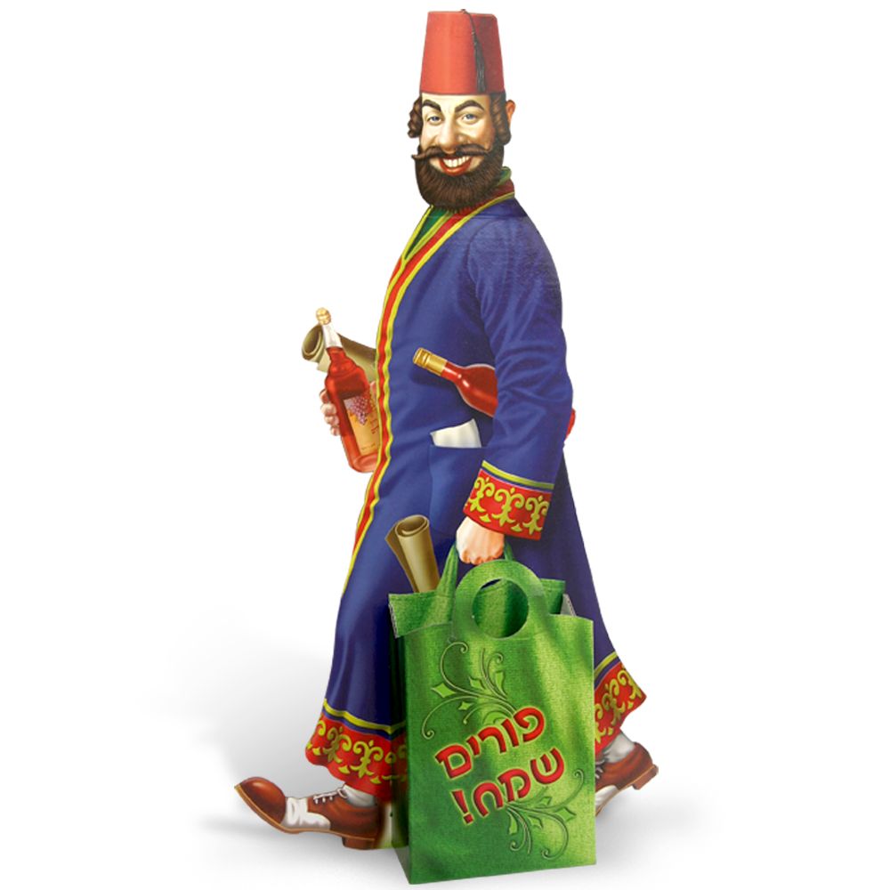 דמות פורימית שמחה ועליזה, עם סל תלת מימד למצווה מהודרת.