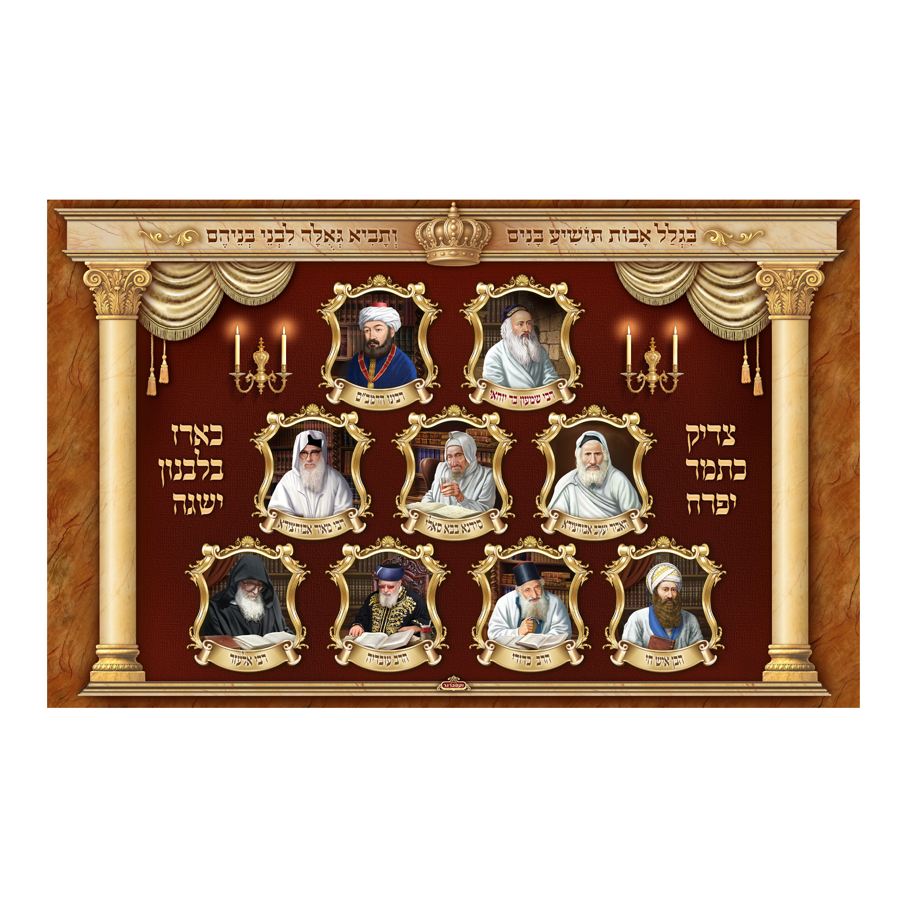 קישוט מרשים לסוכה, המציג את דמויותיהם של רבני ישראל מכל הדורות. התמונה מוסיפה השראה,קדושה וחיבור למסורת היהודית.