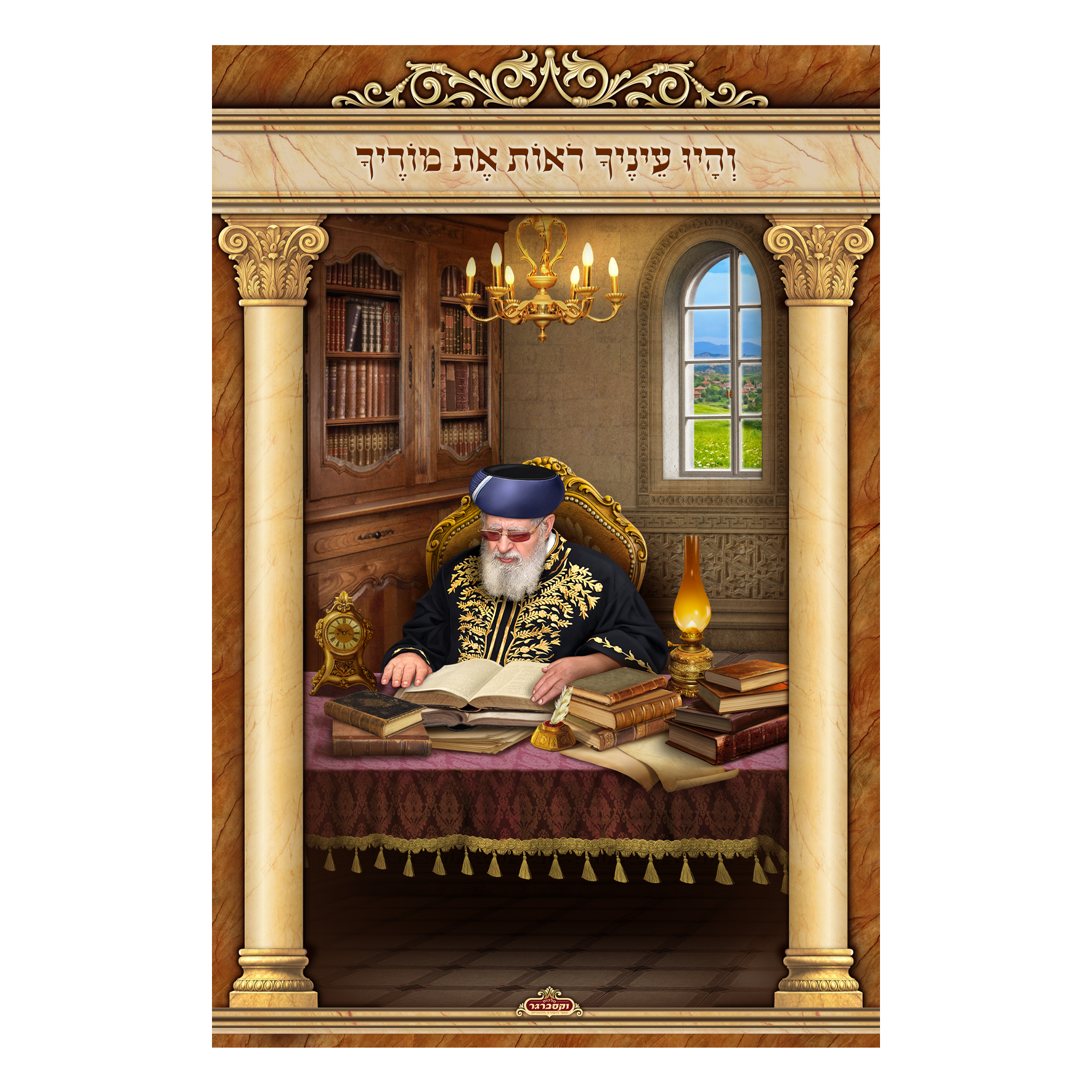 במרכז היצירה מתואר הרב עובדיה יושב בחדר לימוד מהודר, עטוף בגלימתו המסורתית, שקוע בלימוד התורה הקדושה. סביבו שולחן עמוס ספרי קודש, ספרייה עשירה ברקע וחלון הפותח מראה לנוף ירושלמי – כולם יוצרים אווירה של חכמה, קדושה והשראה.
