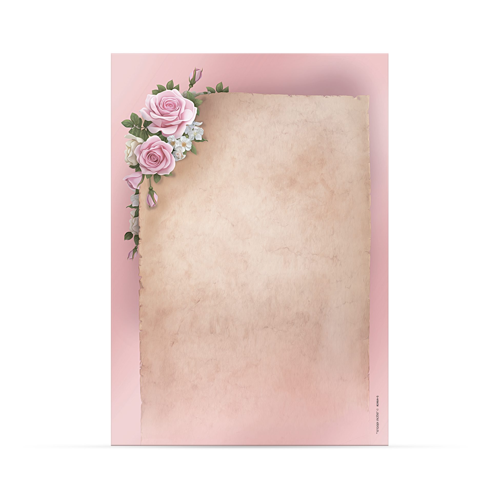 דף רקע קסום ונשי, שמכניס את כל מי שכותב עליו לעולם רגוע, יפה ואופטימי. עם מסגרת בגוון ורוד פודרה עדין, רקע חום־בהיר במרקם קלף עתיק, וזר פרחים רומנטי של ורדים ורודים ולבנים בצידו העליון – העיצוב משדר אהבה, רוך, חלום ותקווה.