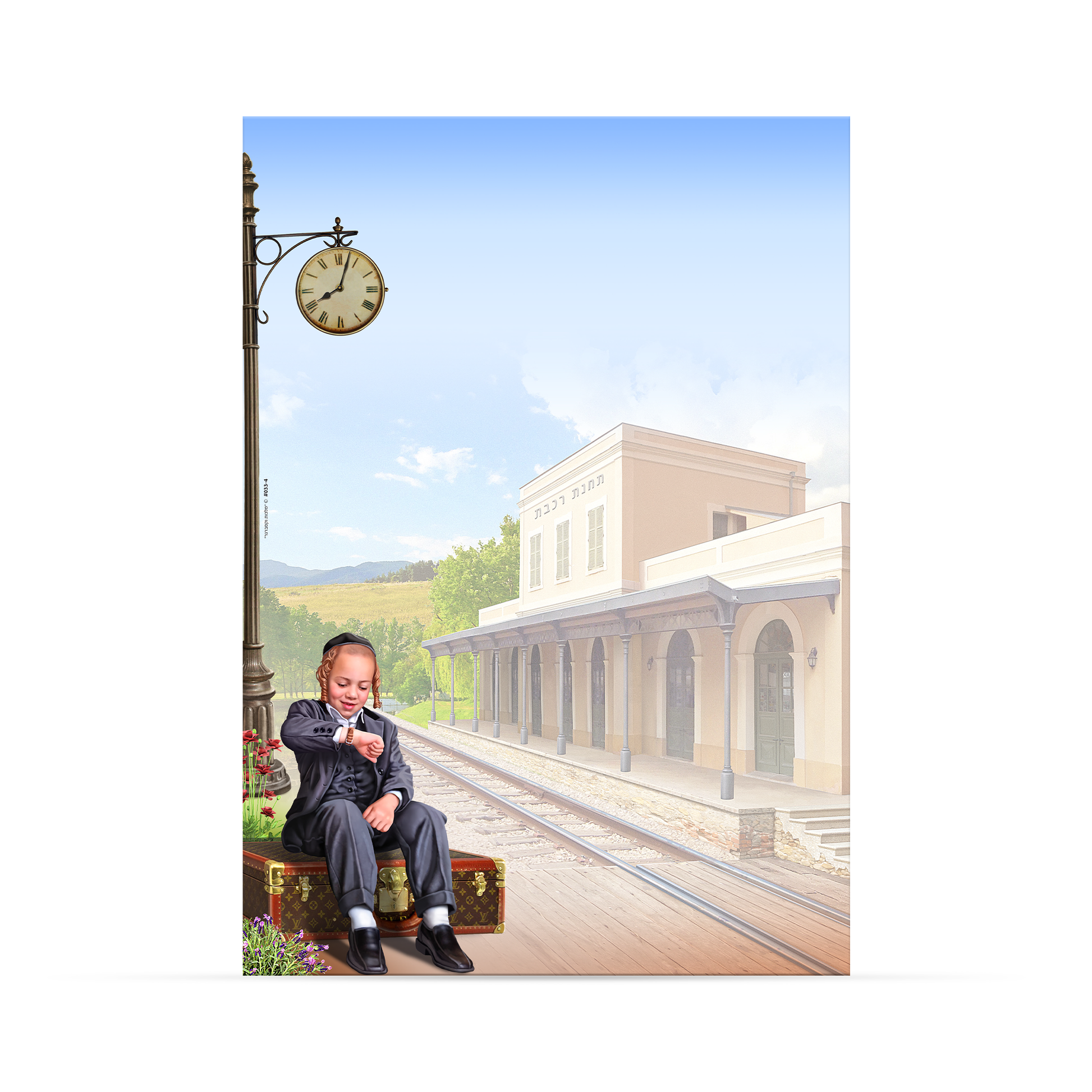 דף רקע מלא מסר, עומק ורגש, עם איור ציורי של ילד חרדי קטן בתחנת רכבת ישנה, יושב על מזוודה ומביט בשעון רחוב עתיק. הרגע הזה – של המתנה, של התבוננות, של תקווה – משדר לנו עד כמה הזמן הוא יקר, וכמה כל שנייה יכולה להיות התחלה של מסע חדש.